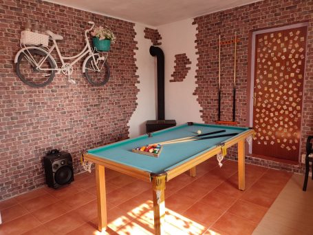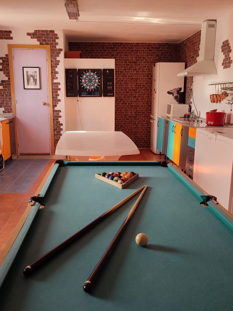 Espacio independiente de la vivienda principal destinado al ocio y las actividades interiores, distribuido en una sala amplia y diáfana. Cuenta con chimenea, zona de estar y mesa de billar, además de juegos, como una diana electrónica con muchas posibilidades de juego y numerosos juegos de mesa, que complementan el ambiente recreativo del espacio.