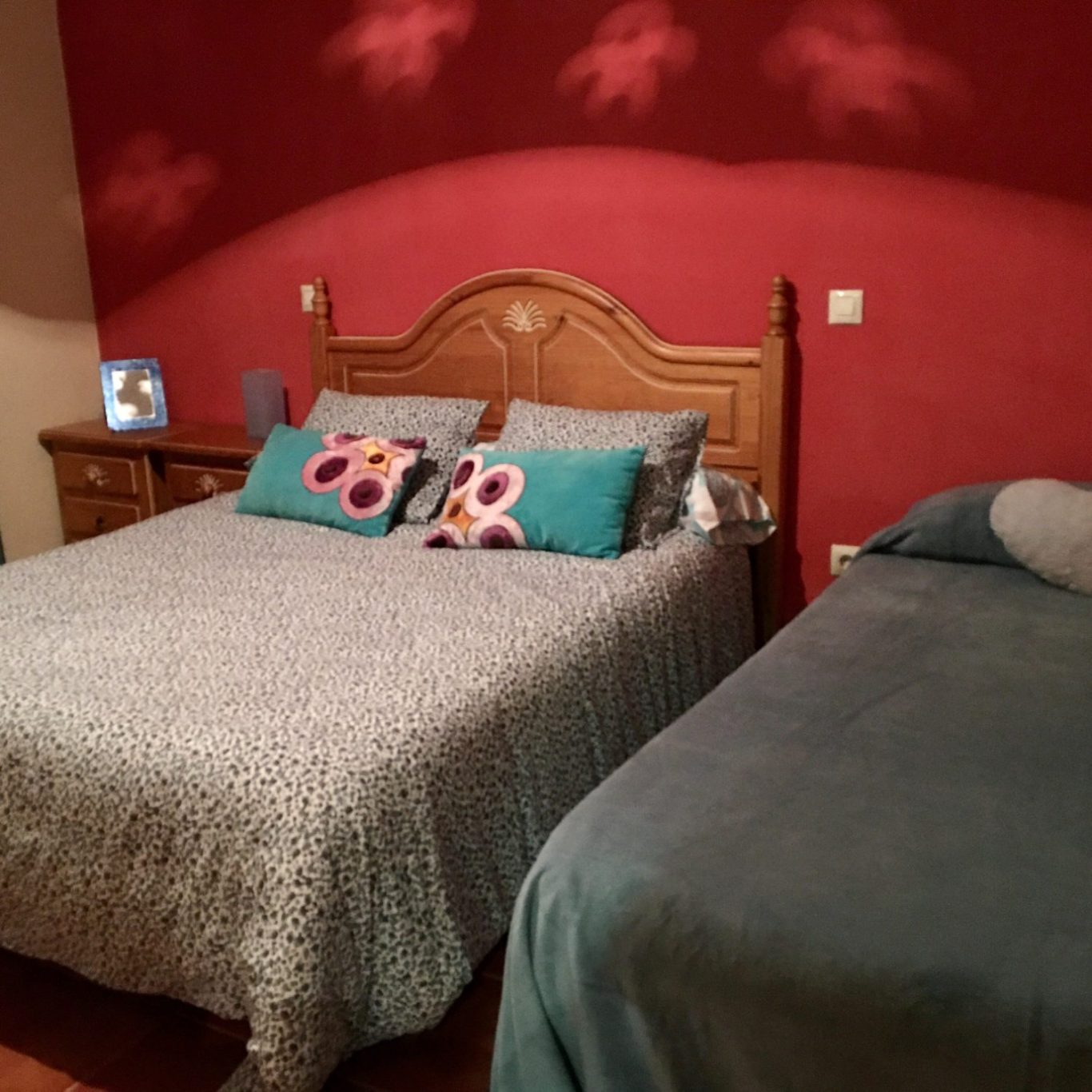 Habitación con dos camas individuales y una supletoria, luminosa y práctica, pensada para ofrecer comodidad y descanso. Cuenta con una decoración sencilla y un ambiente acogedor que mantiene el estilo natural y familiar de la casa rural, creando un espacio tranquilo y funcional.