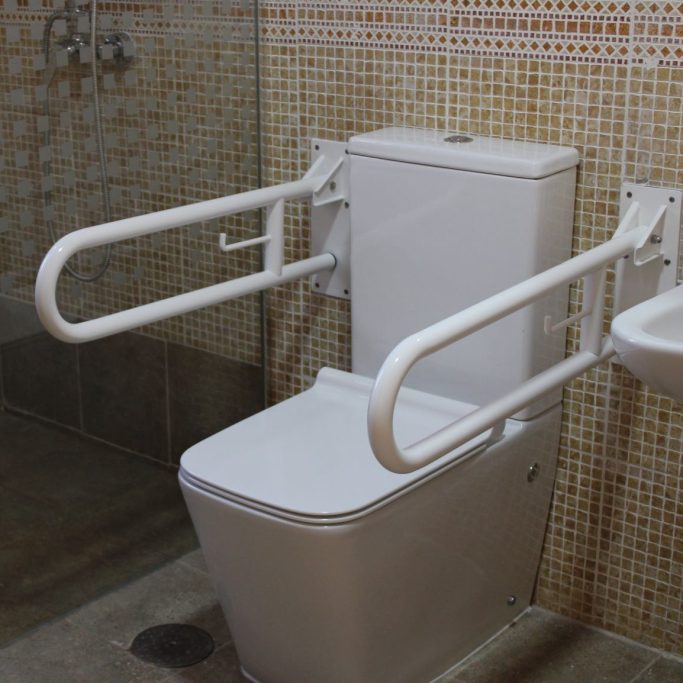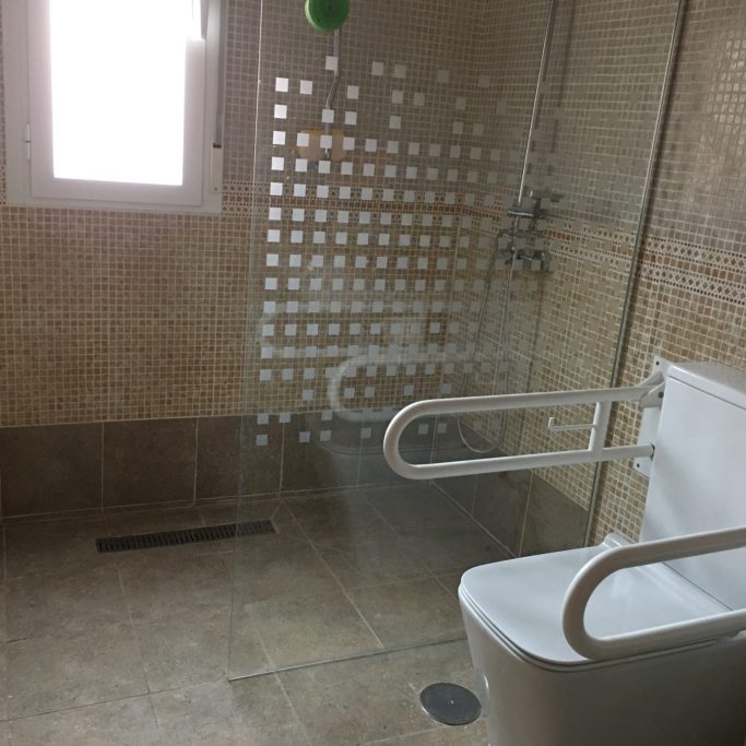 Dormitorio amplio con cama doble de 1,50 m y cama supletoria, ideal para mayor capacidad. Cuenta con baño completo adaptado para personas con movilidad reducida, equipado con ducha a ras de suelo y elementos de apoyo para mayor comodidad.